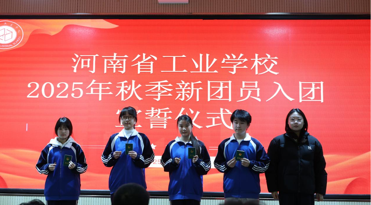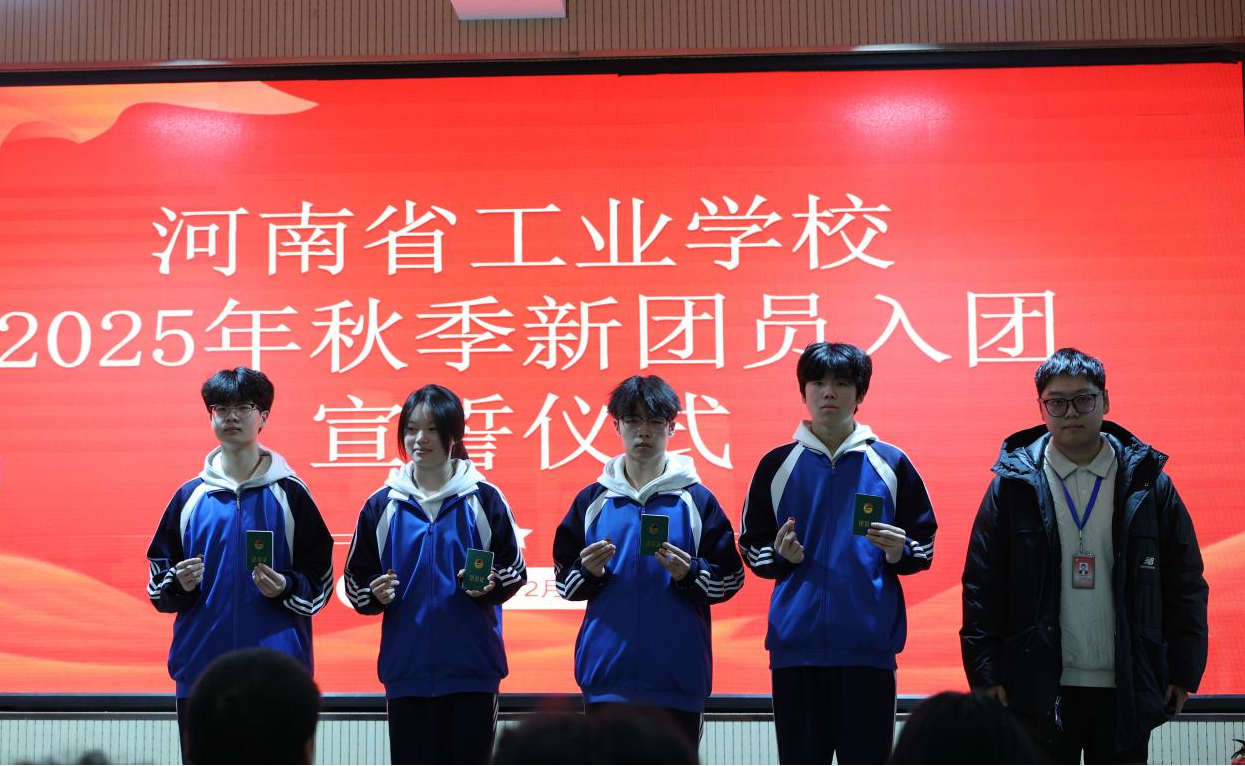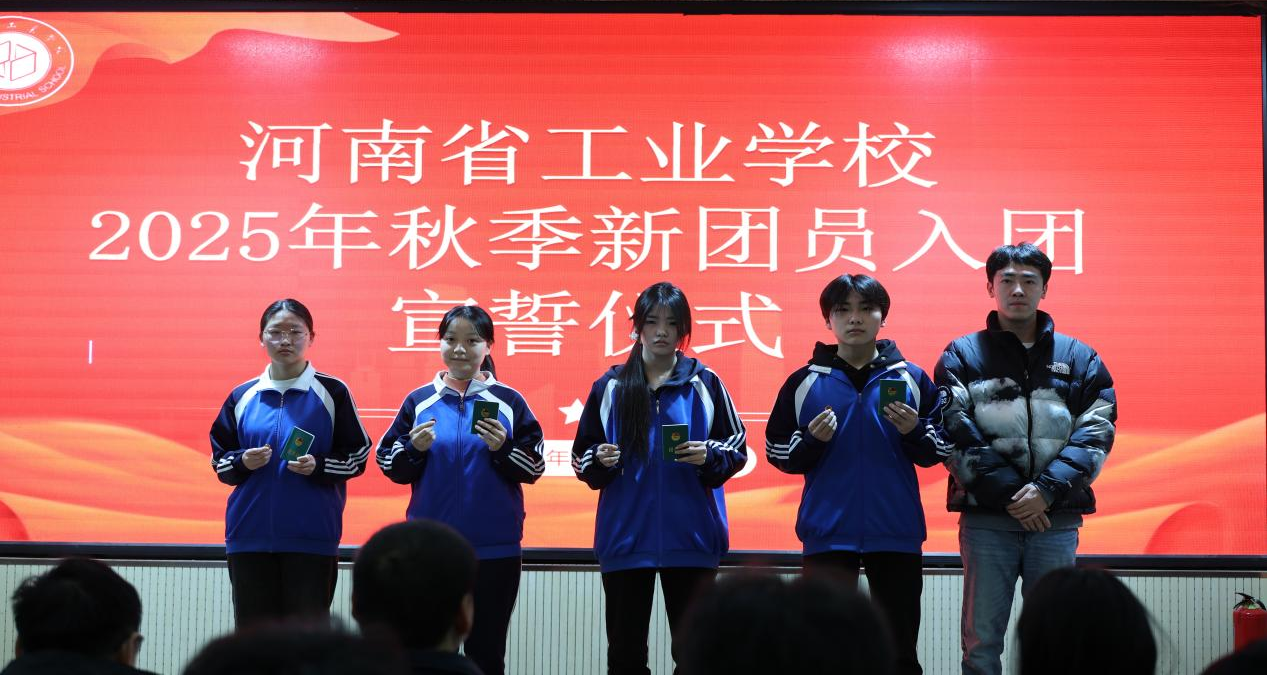 为进一步加强学校共青团组织建设,引导广大青年学生坚定理想信念,传承红色基因,2025年12月23日,河南省工业学校隆重举行2025年秋季新团员入团宣誓仪式。校党委委员、党办及组人科主任尹作为,校团委书记张伟,建艺系团总支书记代子英,经管系团总支书记卢佳会,机电系团总支书记任浩铭出席仪式,与2025级秋季学期新团员共同见证这一庄严时刻。